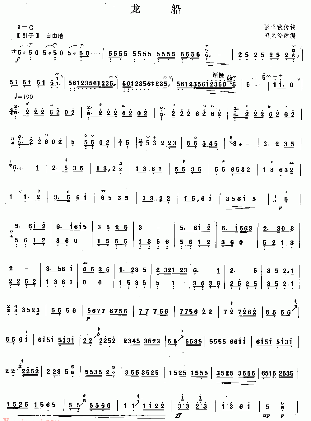 扬琴曲谱:龙船简谱五线谱附歌词是乐器资源网于2013年04月02日 16:05:09整理更新,内容收录在扬琴乐谱栏目;乐器资源网免费分享专业、准确、规范、高清的扬琴乐谱简谱五线谱歌词等电子版资料,欢迎在线免费下载;乐器资源网无需注册会员,即可直接免费下载各类乐器学习相关资源。