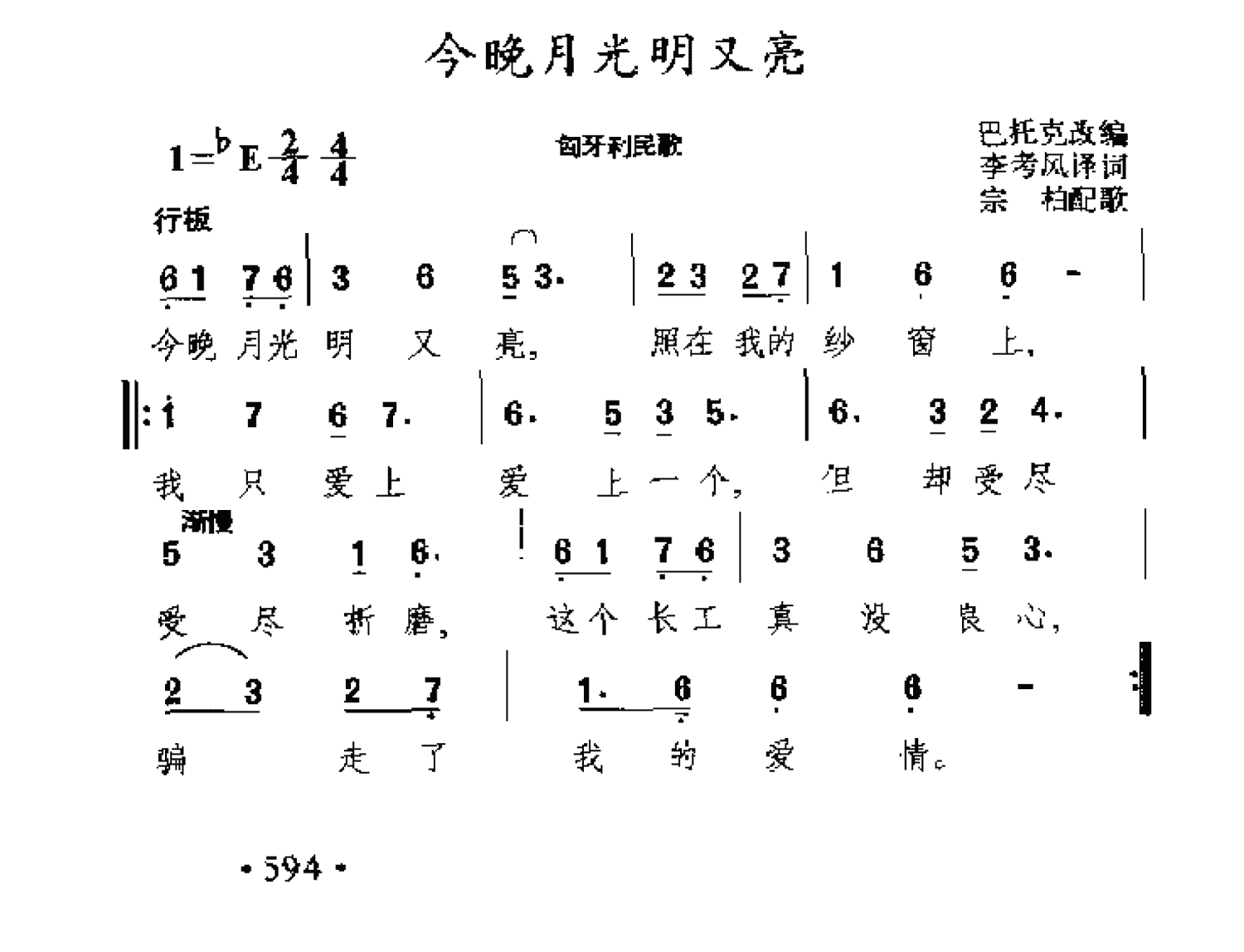 外国民间乐曲简谱:今晚月光明又亮 匈牙利民歌