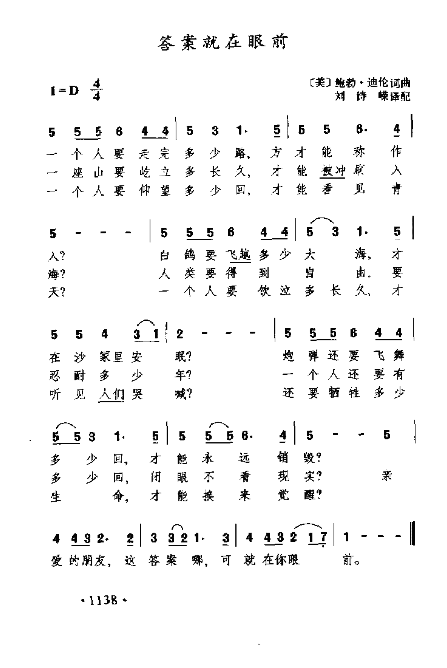 外国现代乐曲简谱:答案就在眼前(美)鲍勃 迪伦曲