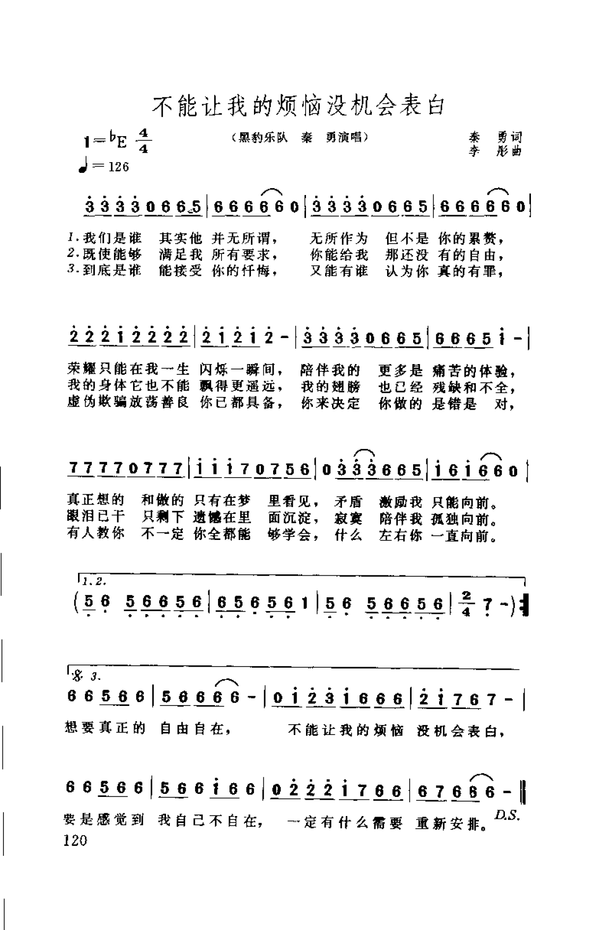 简谱:不能让我的烦恼没机会表白·1995秦勇词 李彤曲(黑豹乐队、秦勇演唱)