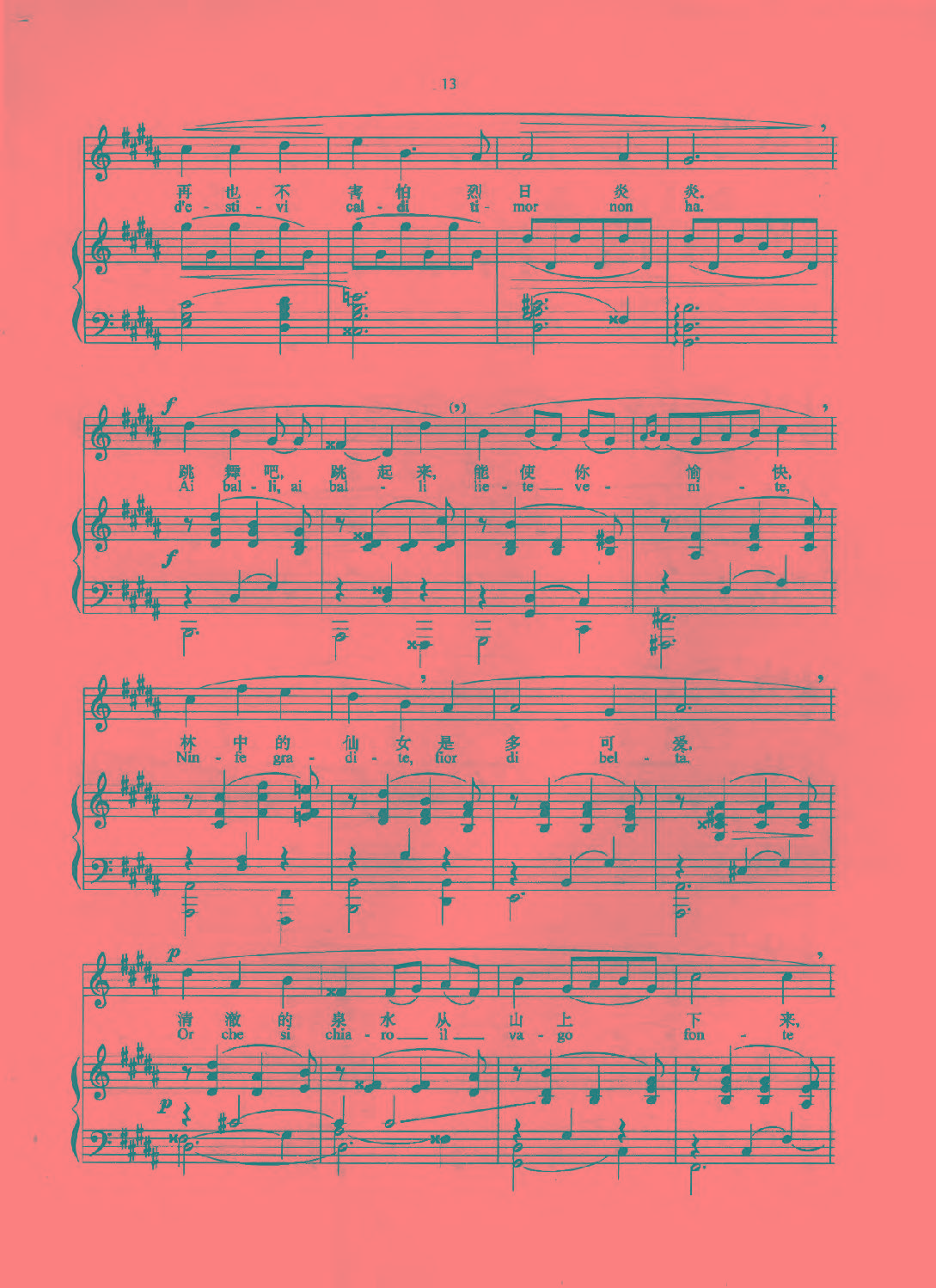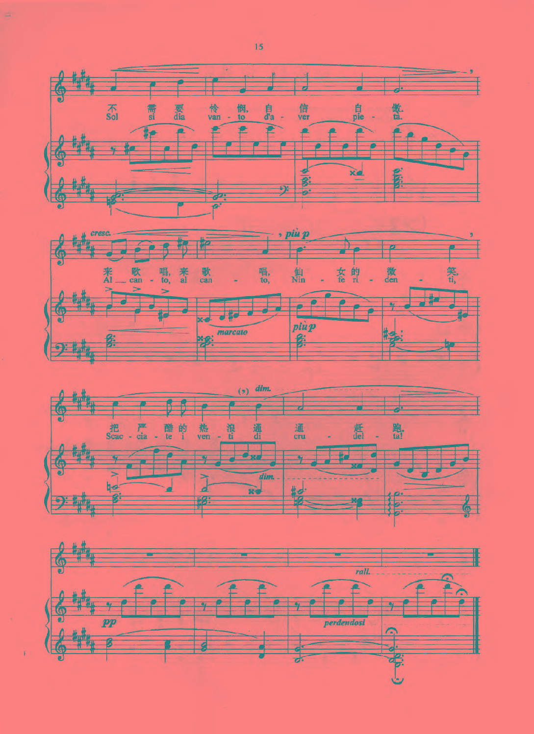 《当温柔的微风》是他早年为他那漂亮的歌喉而创作的,属于“歌曲即歌唱本身”这一类作品。欢愉的旋律在一活泼的调式中戏。这首歌曲有助于初学者掌握优美的连唱(legato)风格,力度从即至mf,显示出真正的抒情音色,速度为中庸平静的快板,演唱时身体要保持安静和松弛状态,只需以够用的张力来保持声音的活力就可以了。注意句法,长句可以在句子中间换气。每句开始吸气要深,但不要,唱歌词以前先用元音练习。
