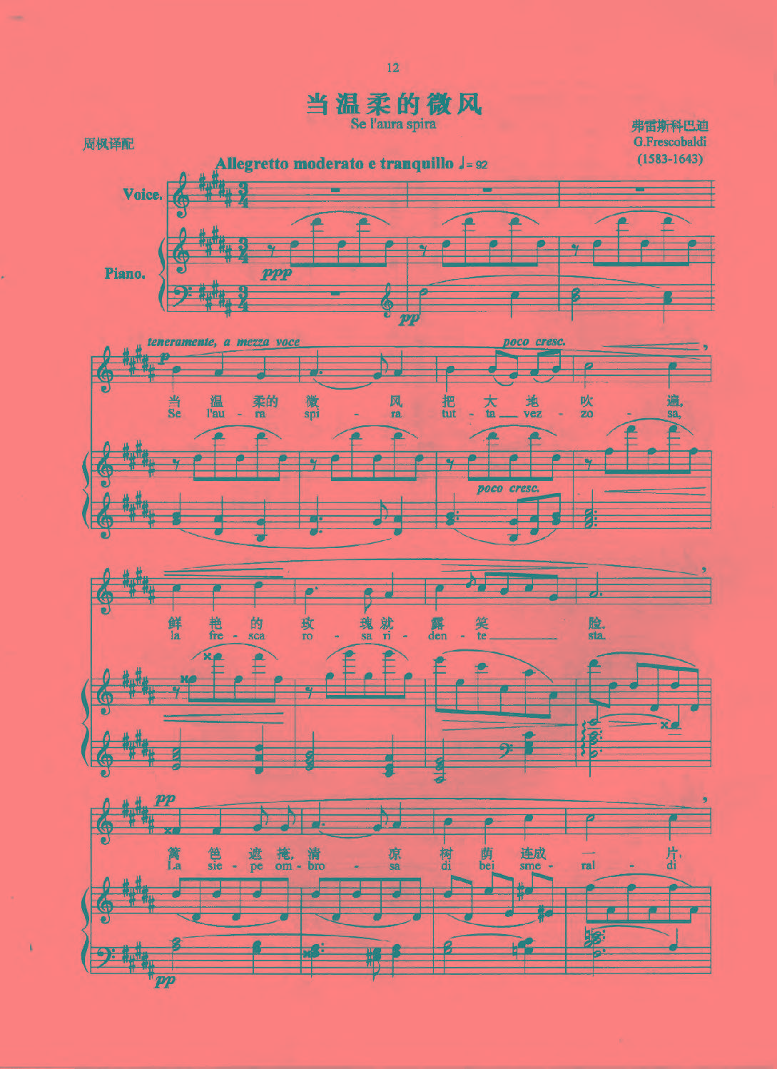 意大利歌曲:当温柔的微风(Se l'aura spira)弗雷斯科巴迪(G.Frescobaldi,1583-1643)五线谱